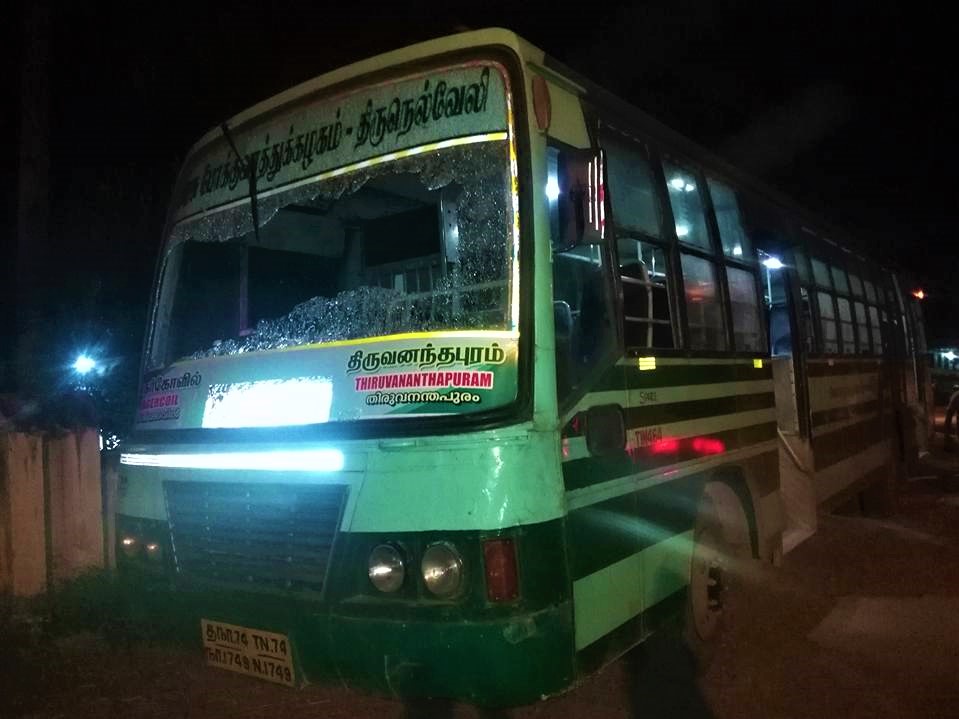 மத்திய அமைச்சர் பொன்ராதாகிருஷ்ணன் சபரிமலையில் அவமதிப்பு செய்த காவல்துறை மற்றும் பக்தர்களுக்கு அடிப்படை வசதிகள் ஏற்படுத்தி கொடுக்காமல் கேரள அரசு அச்சுறுத்தல் ஏற்படுத்துவதாக கூறி பாஜக சார்பில் இன்று முழு அடைப்பு க்கு அழைப்பு விடுக்கப்பட்டுள்ள நிலையில் நேற்று இரவு குமரியில் பதினைந்துக்கும் மேற்பட்ட பேருந்துகள் மீது கல்வீசி தாக்கி கண்ணாடி உடைப்பு..